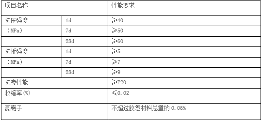 1、高強度,1 天強度抗壓強度≥ 40 MPa,28 天抗壓強度≥ 60 MPa,后期強度高且不倒縮。